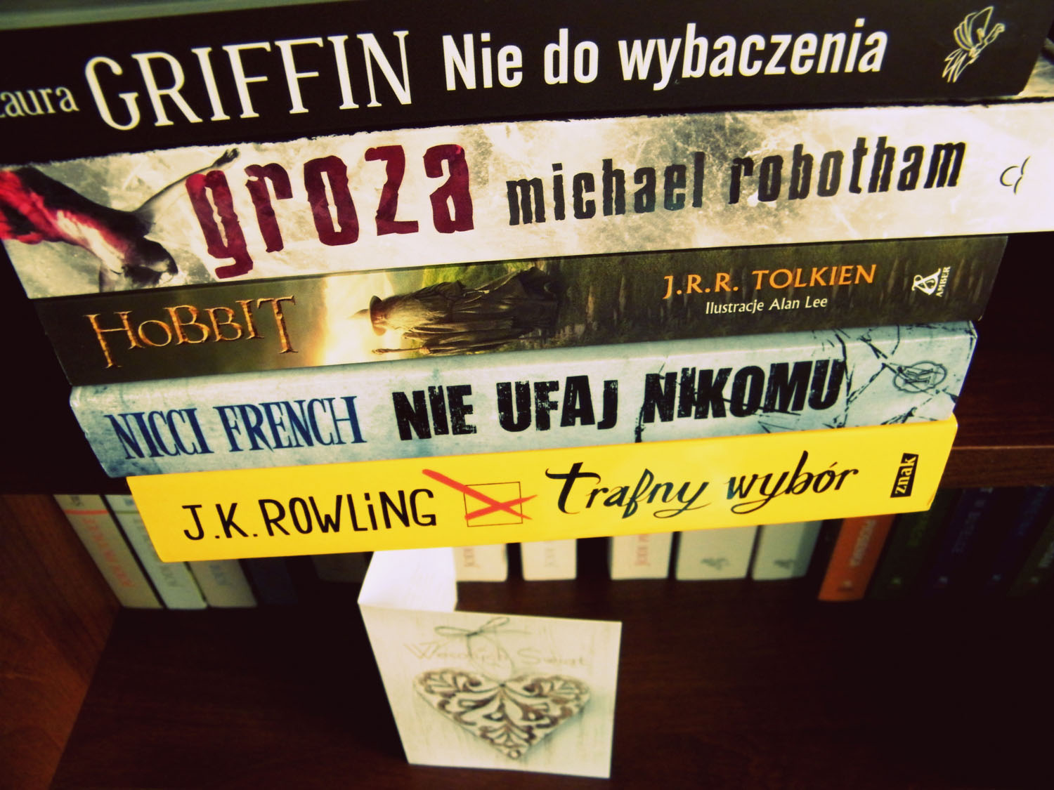 UsuńChętnie przeczytałabym wszystkie książki z Twojego stosu :)"Trafny wybór" czeka na mnie półce od moich urodzin i czeka na swoją kolej. "Hobbita" również mam w planach i chyba w celu jego przeczytania odwiedzę bibliotekę. A reszty książek nie znam, ale chętnie bym poznała, bo są zachęcające, szczególnie zainteresowała mnie "Groza", myślę, że kiedyś po nią sięgnę.