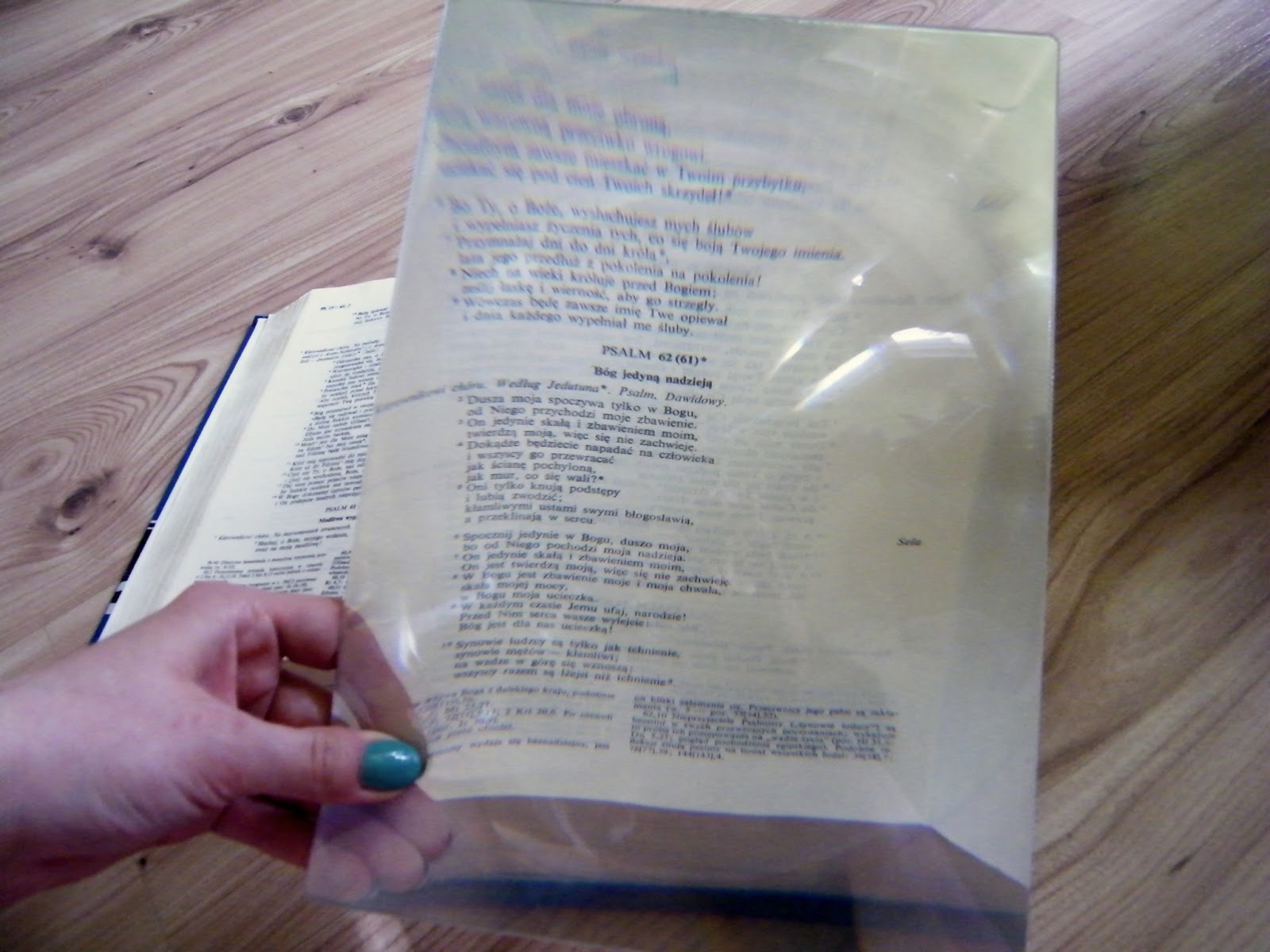 M Wydawnictwo do swojej oferty wprowadziło bardzo interesujący produkt, mianowicie soczewkę ułatwiającą czytanie Biblii. Pismo Święte ma drobniutką czcionkę, która niestety może być przeszkodą dla osób starszych i tych mających problemy ze wzrokiem. Taka soczewka naprawdę bardzo dobrze powiększa tekst, dzięki czemu, odczytywanie poszczególnych wersów nie powinno być aż taką trudnością. Produkt ten jest lekki i cieniutki, a także dobrze leży w dłoni. Na początku wydał mi się niepraktyczny, za duży, jednak po chwili próbowania go, swoje pierwsze obawy odrzuciłam na bok. Soczewka jest świetnym pomysłem i dużą wygodą.
