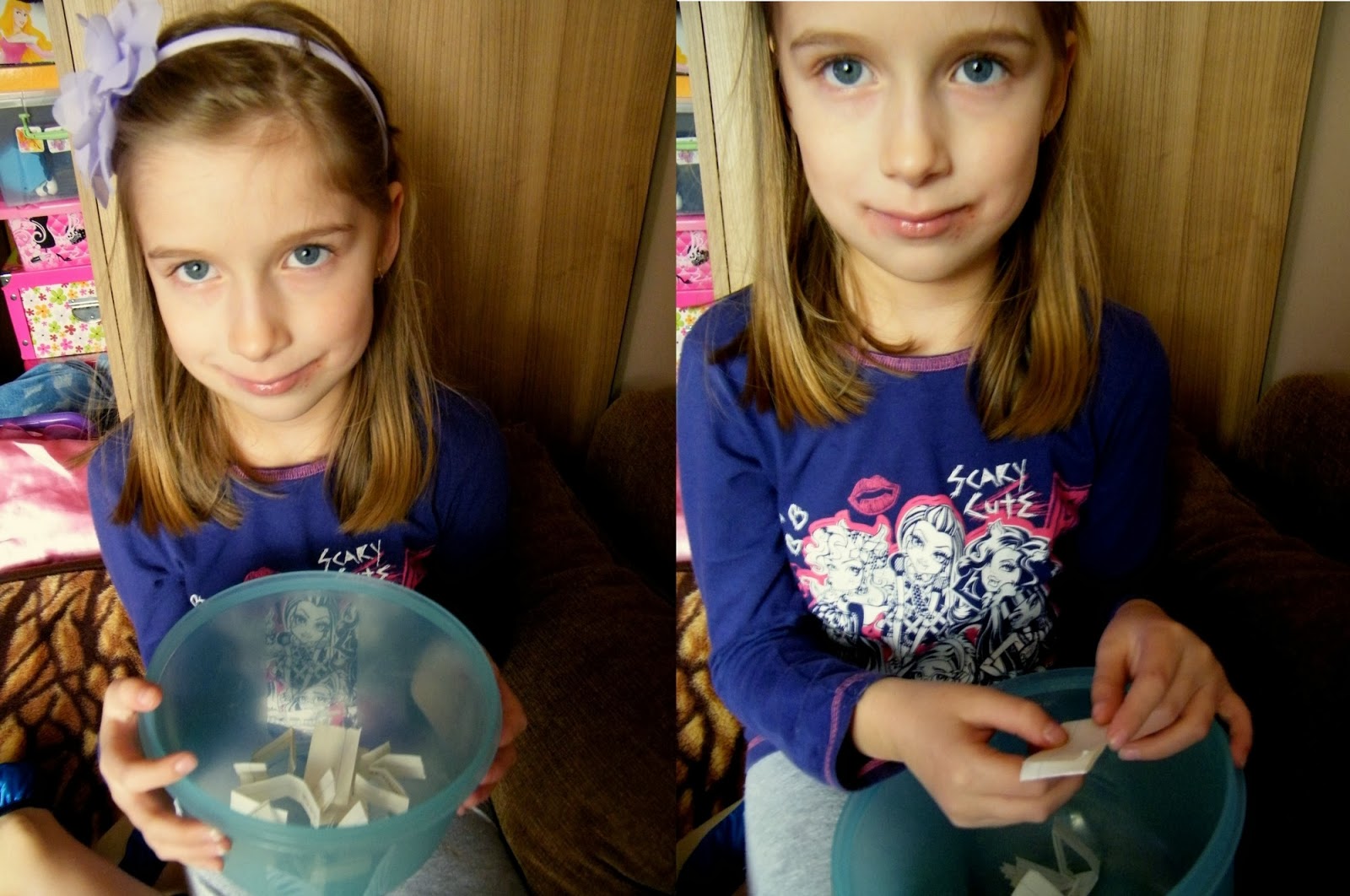 Karteczki umieściłyśmy w miseczce i EmKa rozpoczęła proces... Karteczka wylosowana...